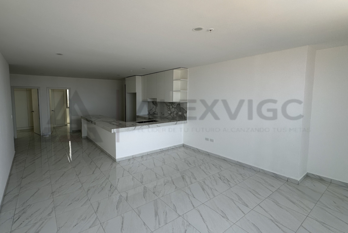 ● Cocina abierta con mesones en blanco carrara y carpintería con acabado en blanco brillante que llegan al tumbado.